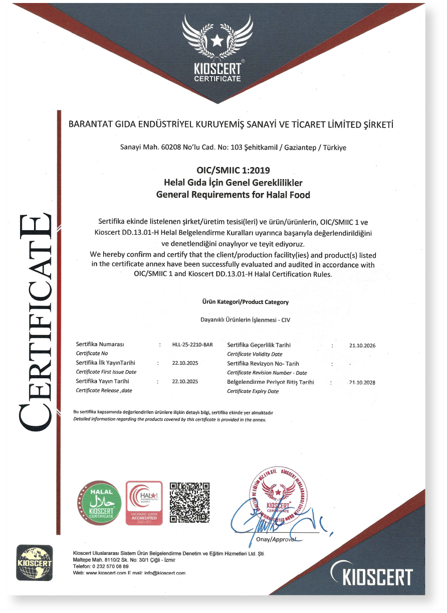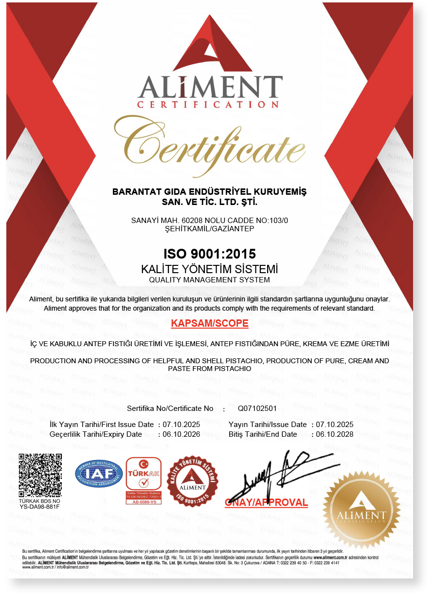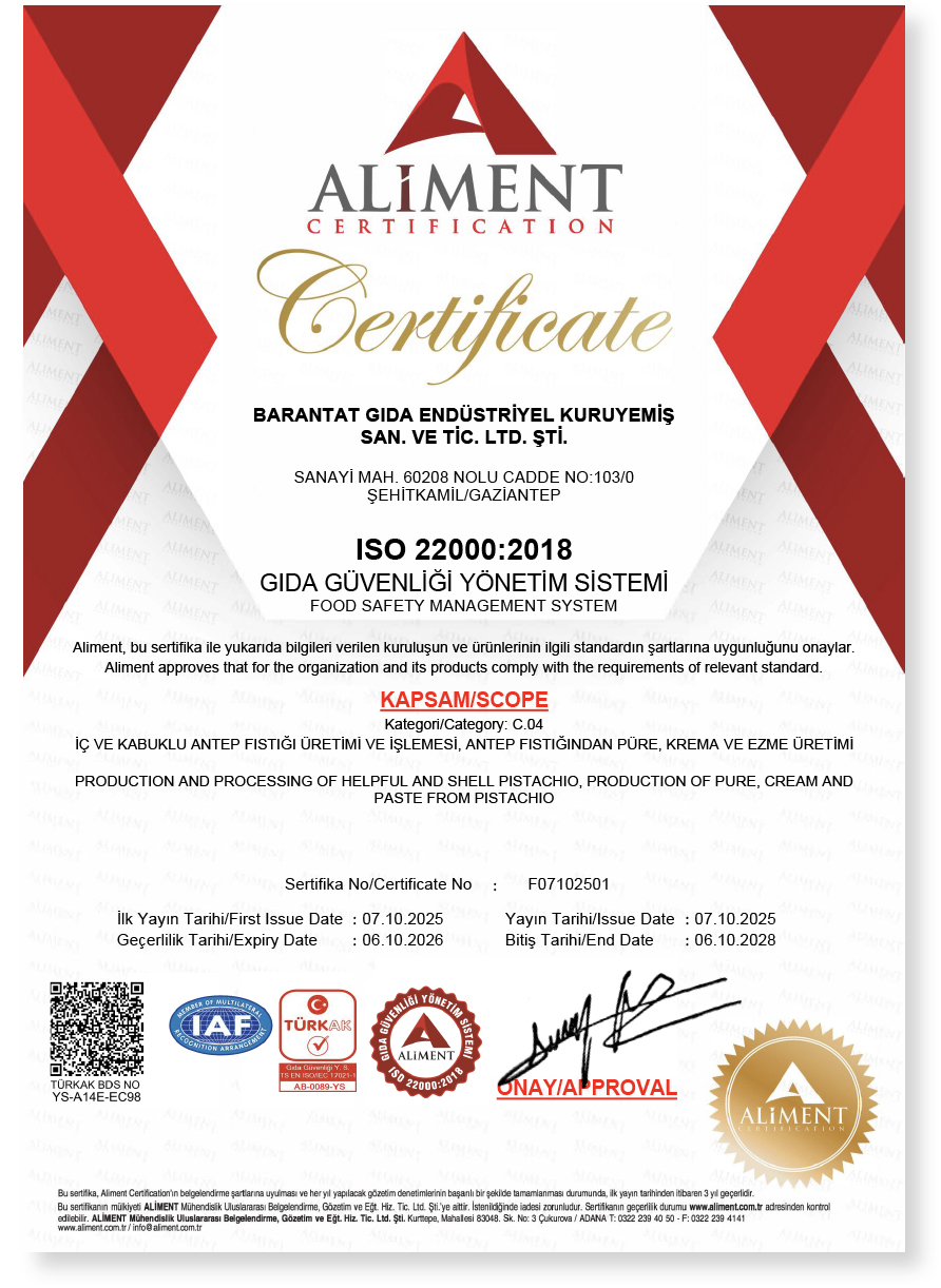 Barantat Gıda Endüstriyel Kuruyemiş Sanayi ve Ticaret Limited Şirketi, 2019 yılında, Antep fıstığının üretim, ticaret ve endüstri merkezi olan Gaziantep’te kurulmuştur.